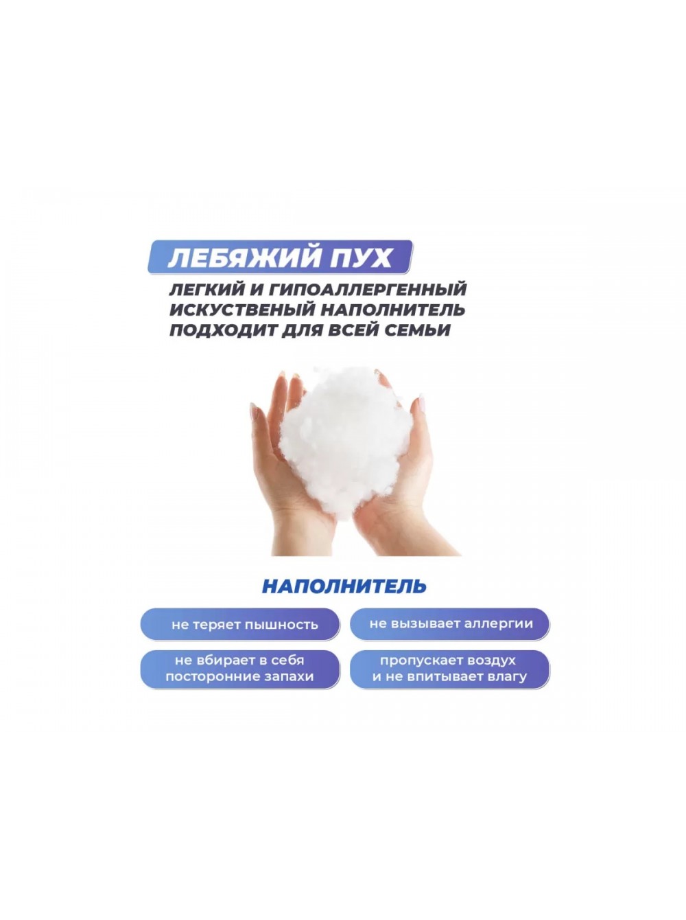 В наполнении подушки содержится искусственный лебяжий пух, который является гипоаллергенным материалом, не требует дополнительного ухода.
