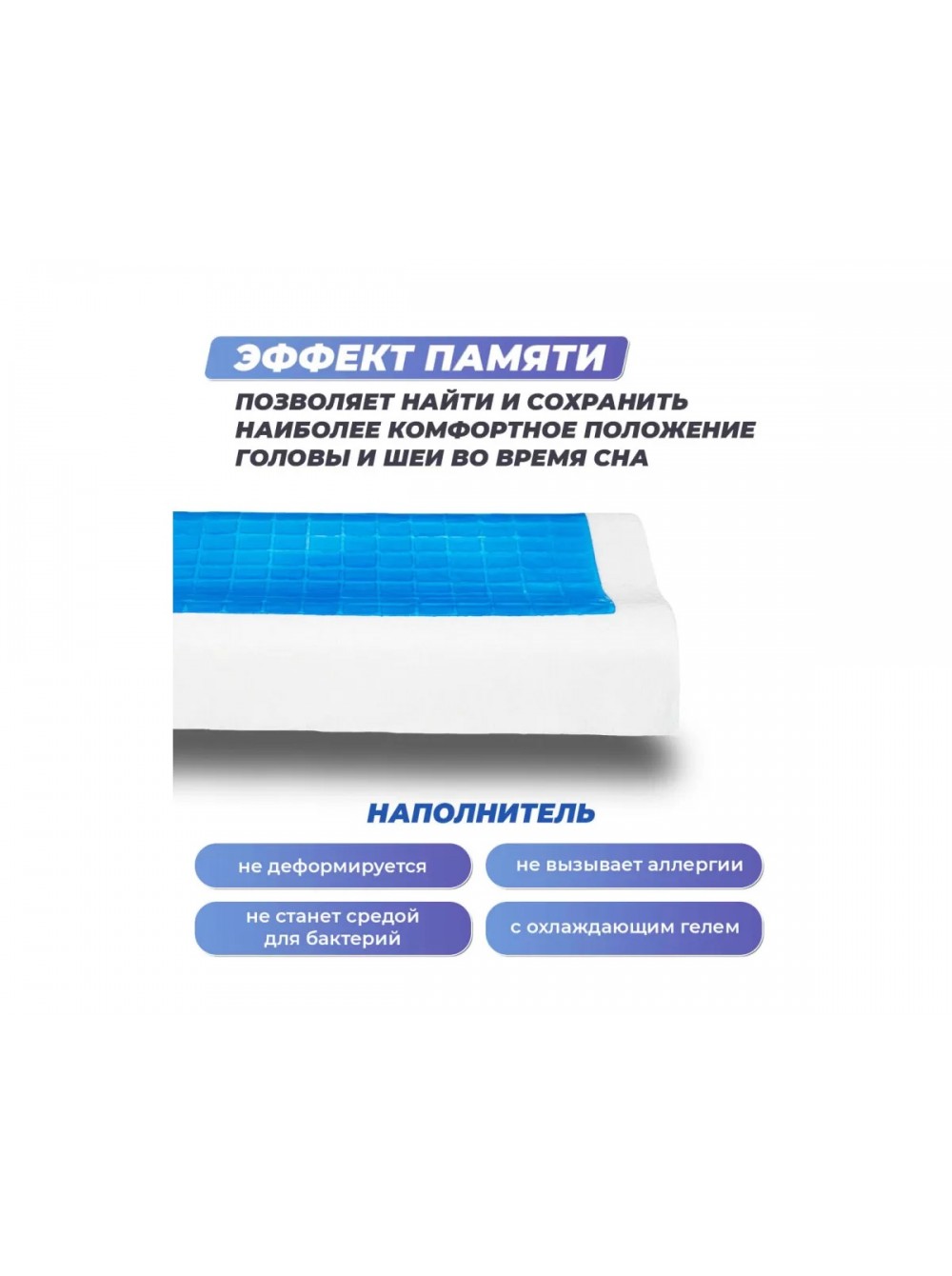 Особенности эргономичная форма с двумя валиками разной высоты, охлаждающий гель поддерживает оптимальный микроклимат и снижает температуру, гипоаллергенный материал, подходит для сна на боку и спине